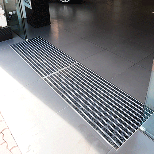 Aluprofil-Fußmatte mit Ripseinlagen für die professionelle Gestaltung Ihres Eingangsbereiches. Die robusten, widerstandsfähigen Schmutzfangsysteme besitzen durch ihre robuste, offene Struktur eine hohe Schmutzfangwirkung.