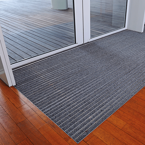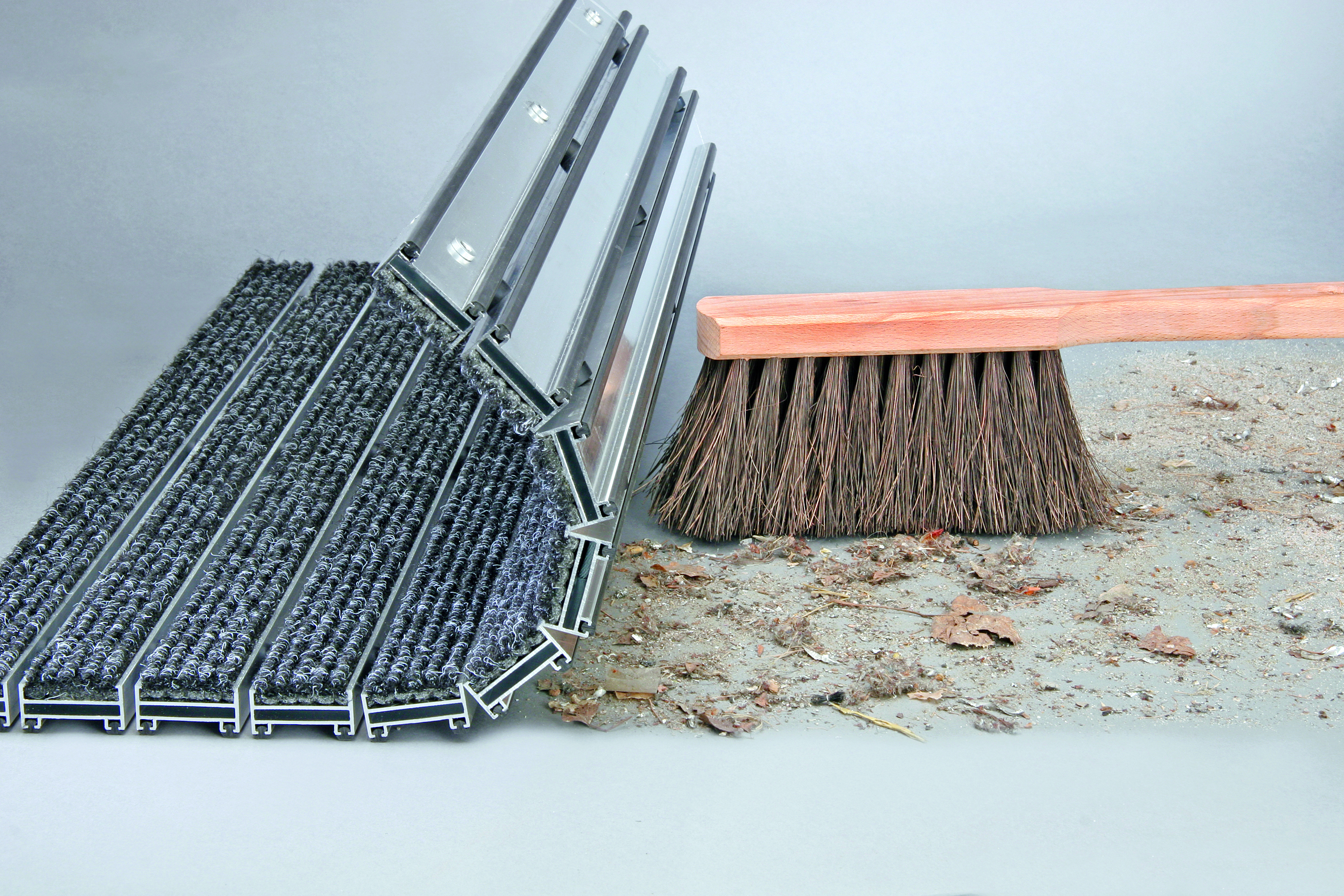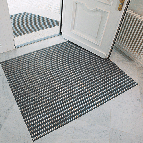Dreck und Feuchtigkeit wird an den Rips-Einlagen gefangen – Grobschmutz und Flüssigkeiten werden zwischen den Stegen zum Boden abgeführt. Ideale Schmutzfanglösung für Innenbereiche bei hohem Publikumsverkehr – Aluprofilsystem für Gewerbe, Verwaltungen, öffentliche Gebäude, Krankenhäuser usw.
