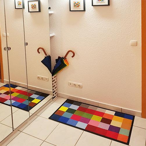 Hochwertige Designmatte aus High Twist Nylon. Die Eingangsmatte ist mittels hochauflösendem Chromojet-Verfahren bedruckt. Durch dieses Verfahren erzielt man rel. hochauflösende Motive und kann z.T. sogar Fotos drucken. Die Matte kann auch in der Waschmaschine gewaschen werden (30°C, sanfte Reinigungsmittel) und die Farben strahlen auch nach bis zu 100 Wäschen noch wie neu. Die Fussmatte streift Nässe, Schmutz und sogar Öl zuverlässig ab. Das knallig-bunte Schachbrettmuster ist für jeden Eingang ein fröhlicher Hingucker – Tschüss Traurigkeit und Langeweile!