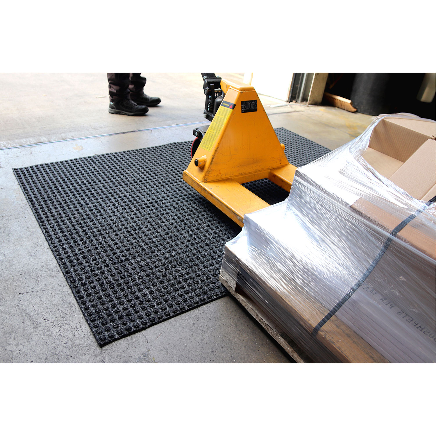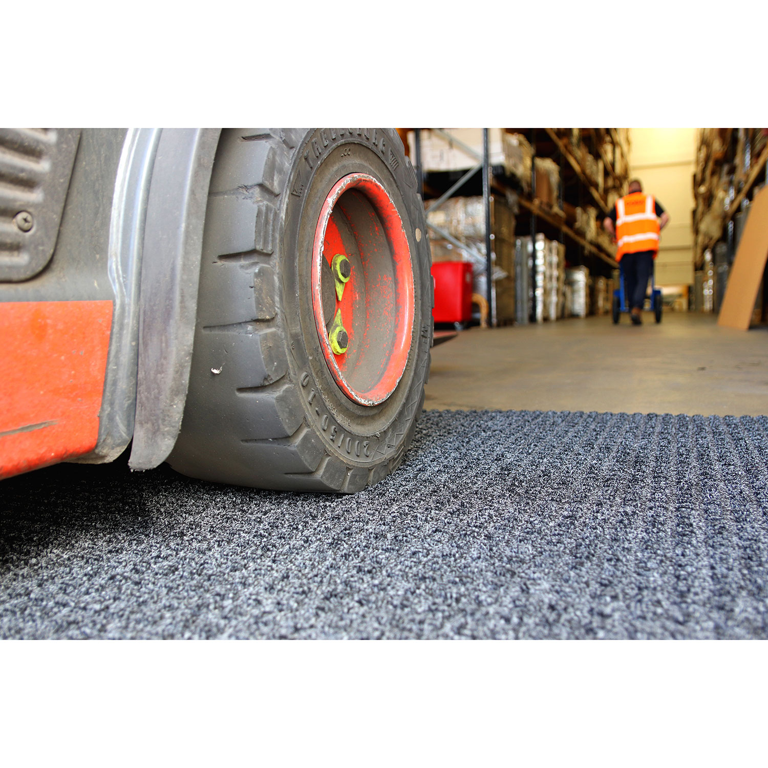 Unempfindliche Schmutzmatte für den Einsatz in Lagerhallen, Industriekomplexen oder Fabriken. Die Schmutzmatte FORKLIFT PROTECT hält hohen Belastungen von bis zu 6 Tonnen pro m2 problemlos stand. Die Sauberlaufprofilierung ist fest in den Mattenrücken verwebt und bleibt selbst unter dauernder Belastung durch z.B. Gabelstapler zuverlässig in Form.