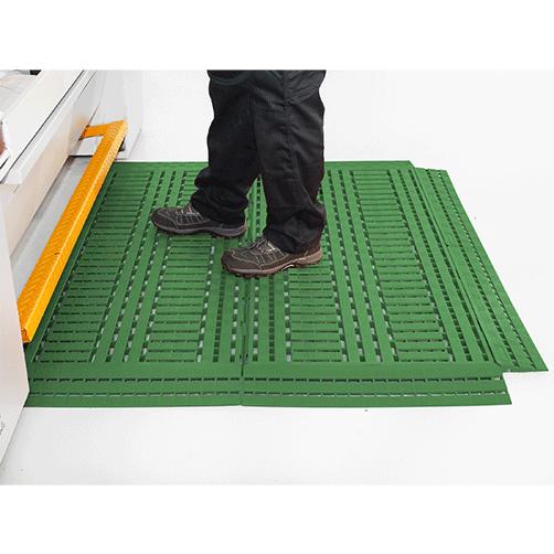 Der bis 40.000 kg/m² belastbare Fußbodenrost Work-Deck lässt durch seine offene Struktur Flüssigkeiten schnell abfließen und nimmt Verarbeitungsreste problemlos auf – sorgt daher für eine trockene und rutschhemmende Oberfläche in nassen Bereichen oder in Bereichen mit Anfall von Spänen, Schneidresten usw.