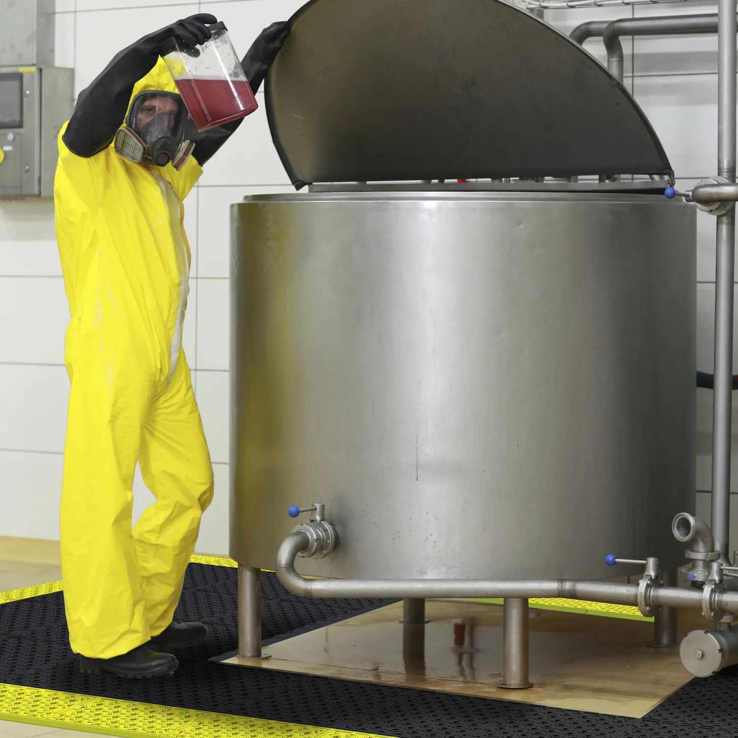 Quadratische PVC-Steckfliesen Antirutsch mit exzellentem Drainage-Effekt, die den Einsatz an feuchten oder sogar öligen Arbeitsplätze ermöglicht.