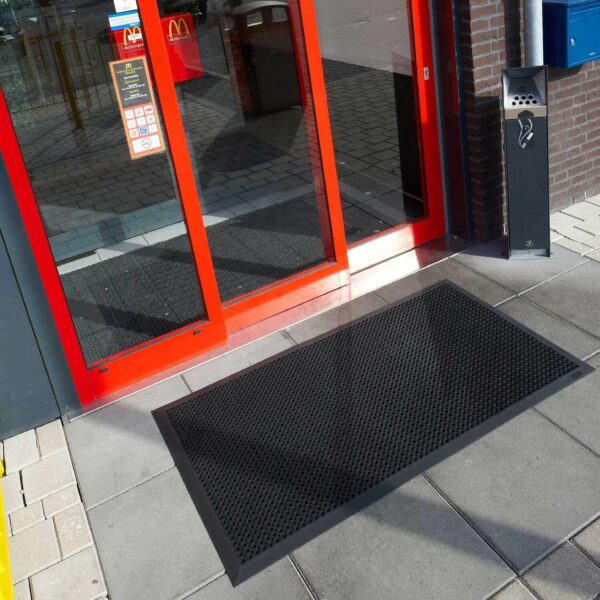 Hochwertige Eingangsmatte für Außenbereiche mit hoher Belastung. Abgeschrägte Kanten und die extra kleinen Waben machen ein Befahren mit Rollstühlen, Einkaufswagen oder Karren möglich. Feuchtigkeit und Schmutz kann durch die Löcher schnell abfließen und es entsteht ein sehr guter Drainage-Effekt.